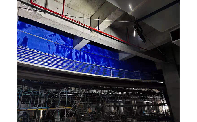 擋煙垂簾垂壁根據(jù)設計要求和現(xiàn)場實際情況采取如下施工順序:首先,搭設腳手架一放線一打眼--上脹栓一焊骨架。第二,吊件一安裝骨架…